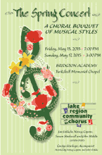 We perform two concerts each year. One falls in early December and features holiday music. The other is a springtime concert generally falling in mid-May. Our Concerts are now comfortably held at Lake Region Highschool Auditorium. (see map). All concerts are free, though donations are gratefully accepted.